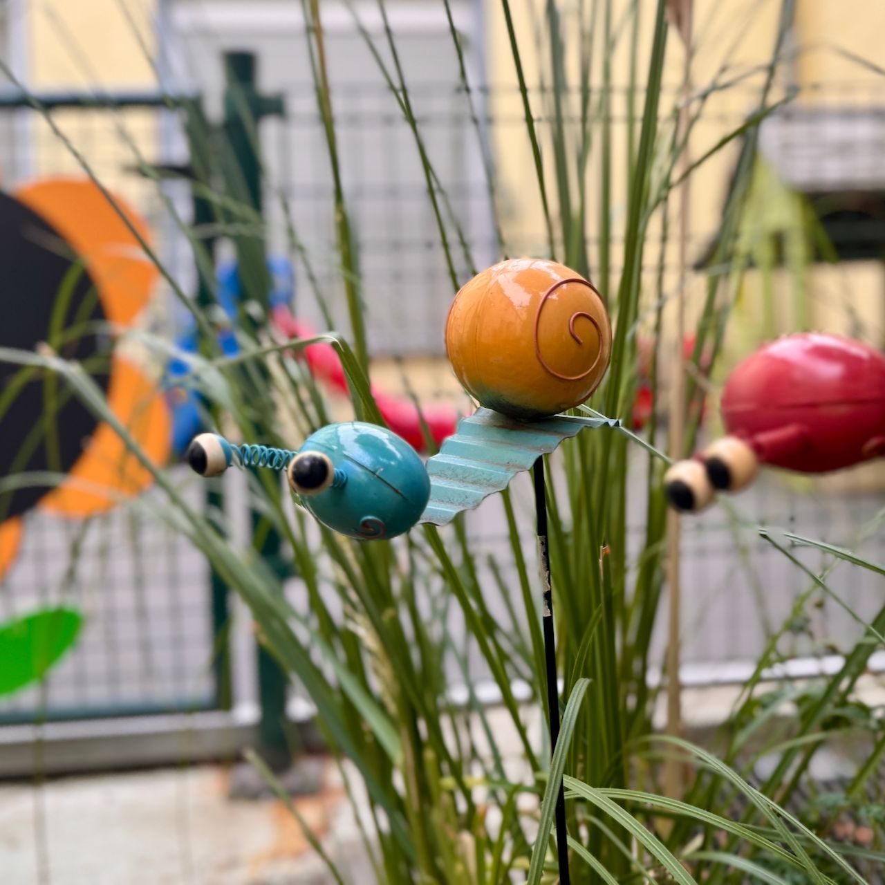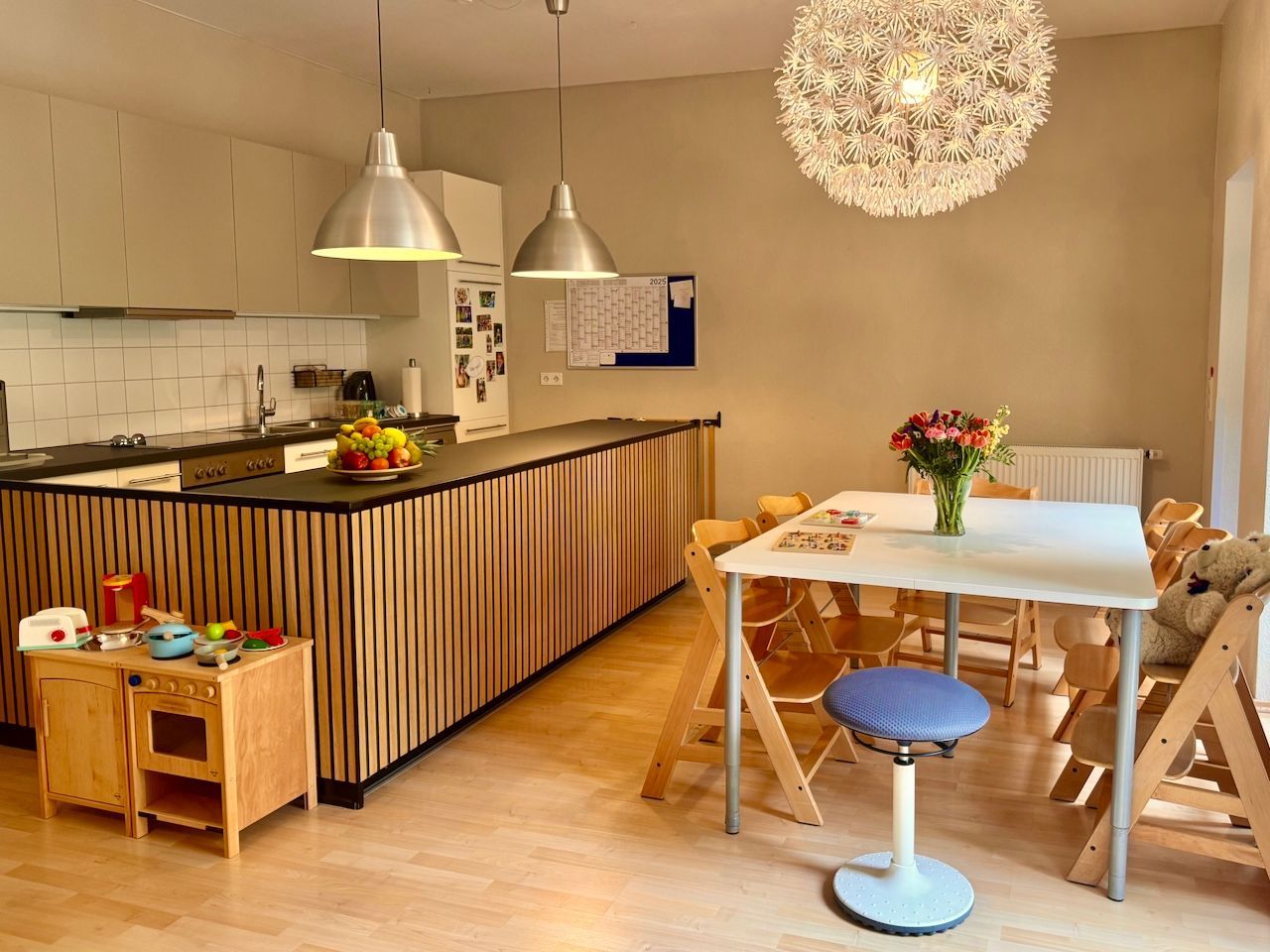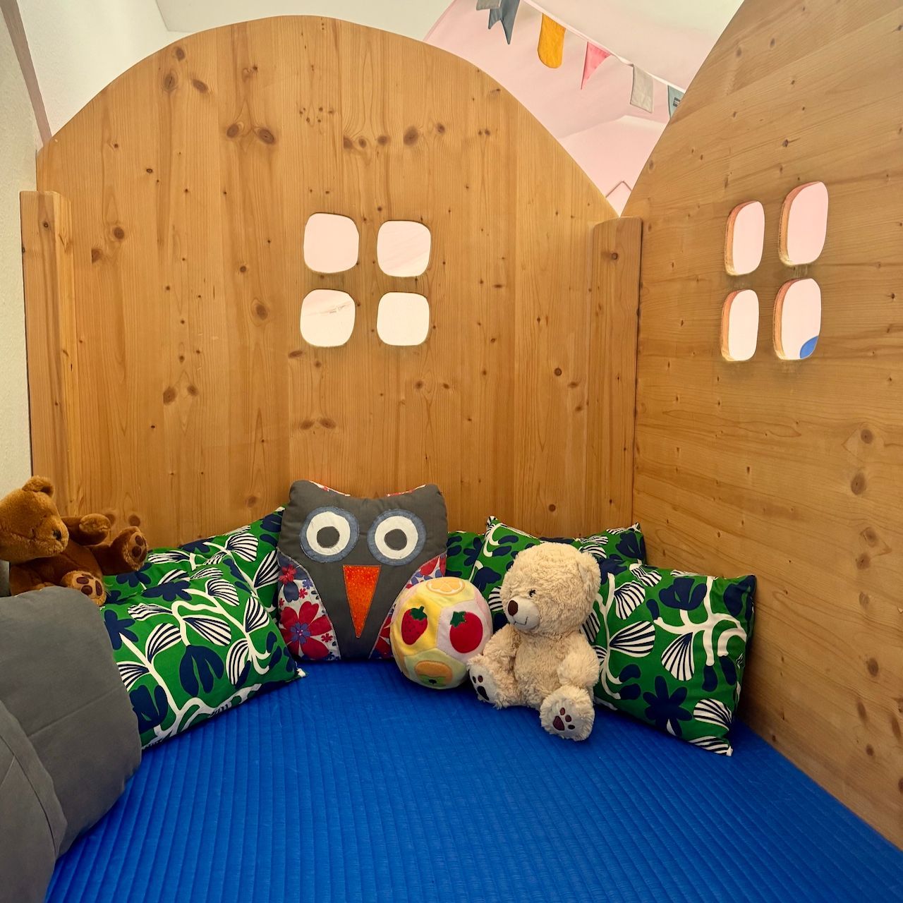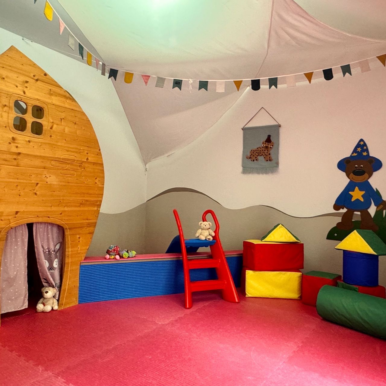 Es gibt zentral einen großen Gemeinschaftsraum mit Basteltisch und Leseecke, einen Bewegungsraum mit Kletterturm, Kuschelhöhle und Bällebad, sowie einen gemütlichen Schlafraum für den Mittagsschlaf oder kleine Ruhepausen.