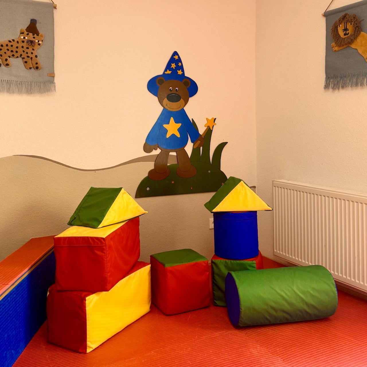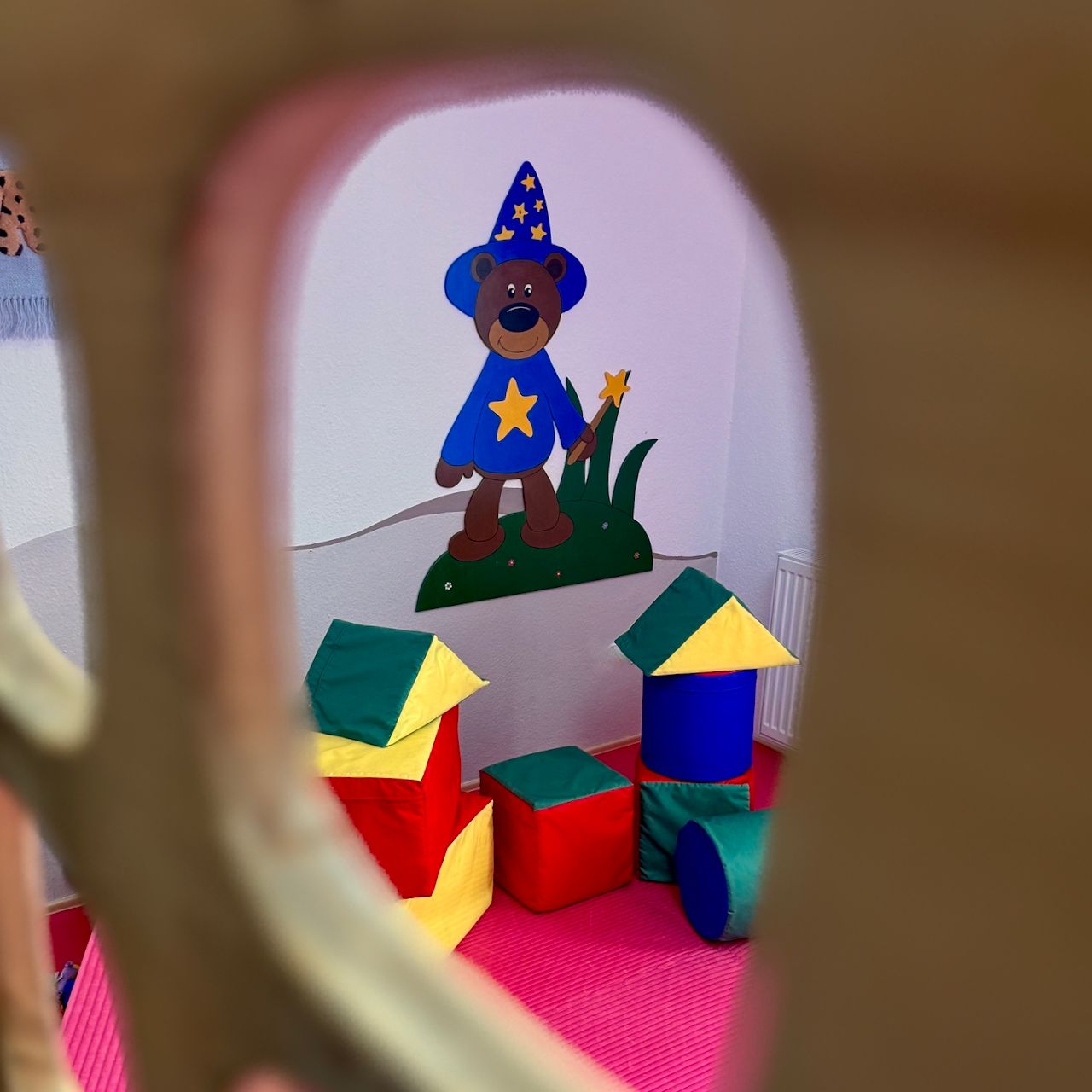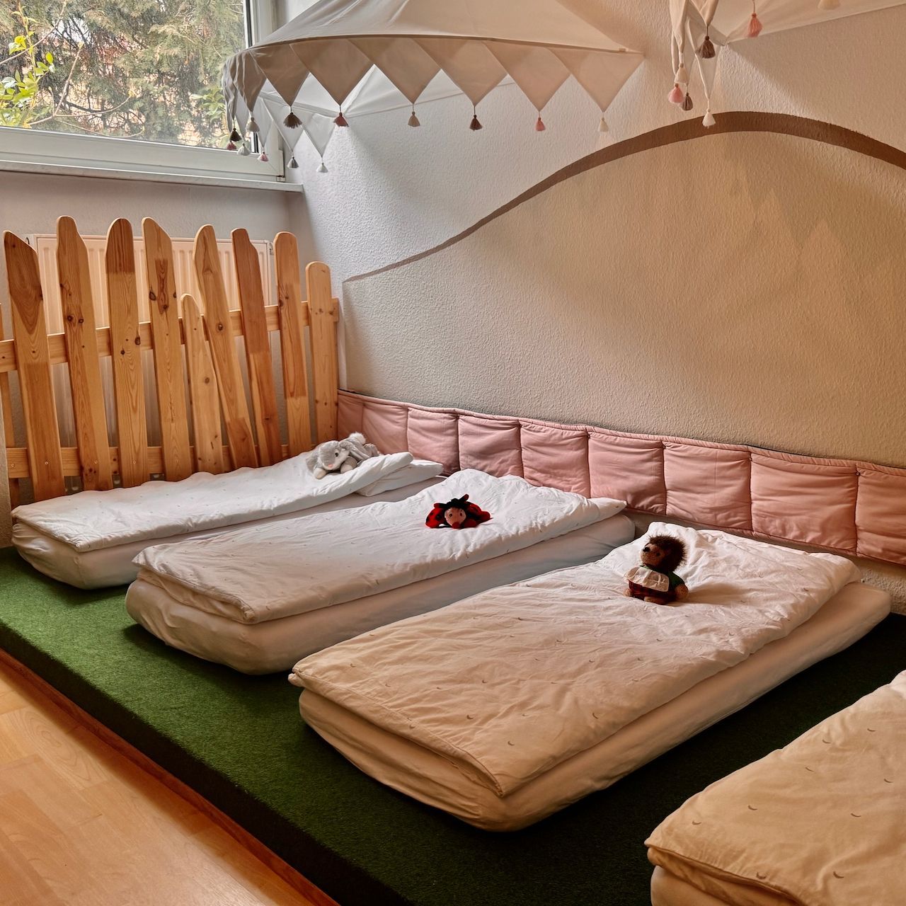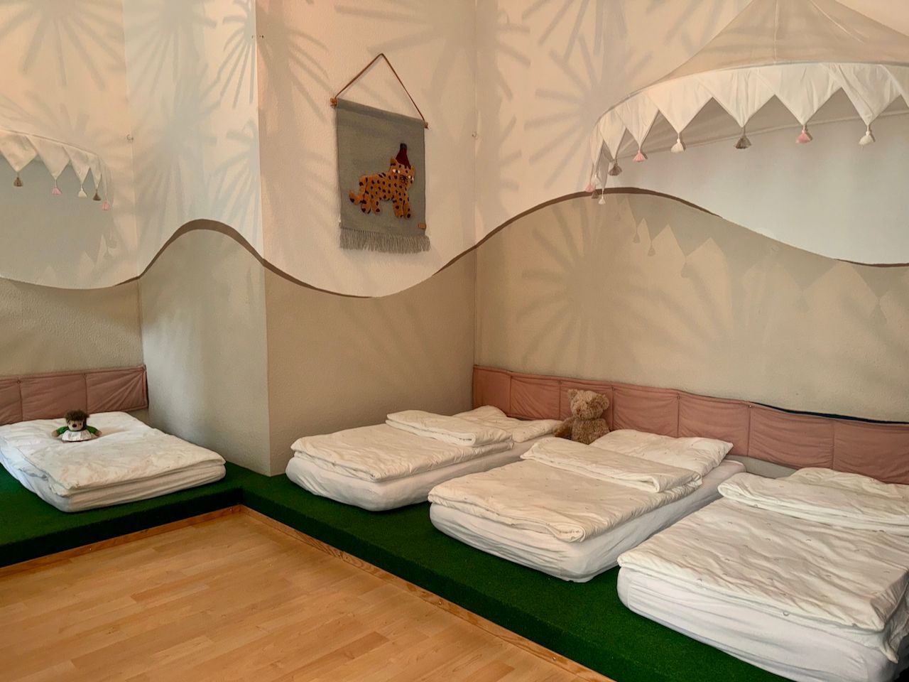 Es gibt zentral einen großen Gemeinschaftsraum mit Basteltisch und Leseecke, einen Bewegungsraum mit Kletterturm, Kuschelhöhle und Bällebad, sowie einen gemütlichen Schlafraum für den Mittagsschlaf oder kleine Ruhepausen.